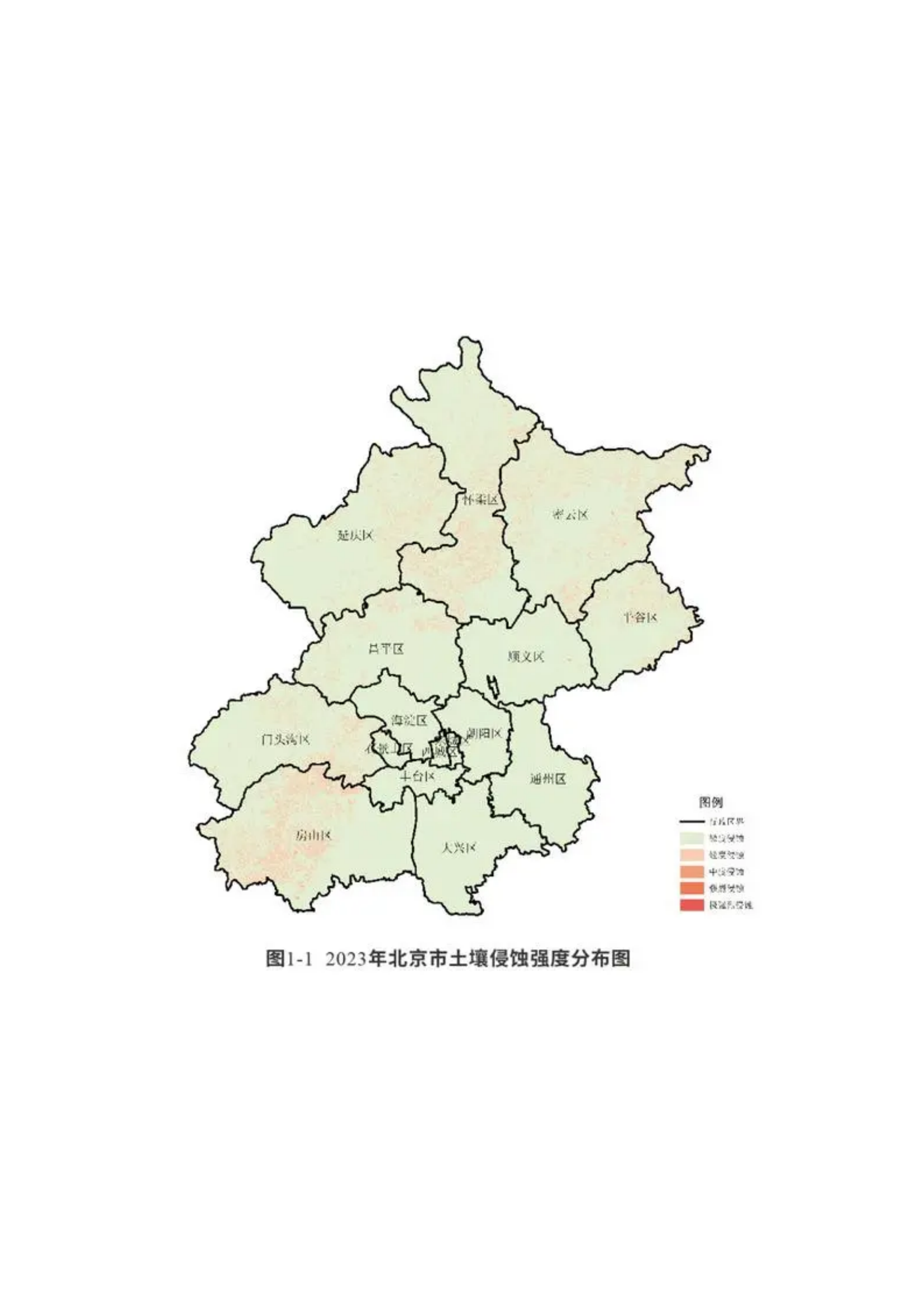 2023年北京市水土流失动态监测成果表明,2023年,全市水土流失总面积1788.69平方公里,占全市总面积的10.90%,土壤侵蚀类型为水力侵蚀。其中,轻度侵蚀、中度侵蚀、强烈侵蚀、极强烈侵蚀面积分别占水土流失总面积的99.119%、0.735%、0.142%、0.004%,无剧烈侵蚀面积。与2022年相比,2023年北京市水土流失面积减少了108.21平方公里,减幅5.70%。全市水土保持率达89.10%。